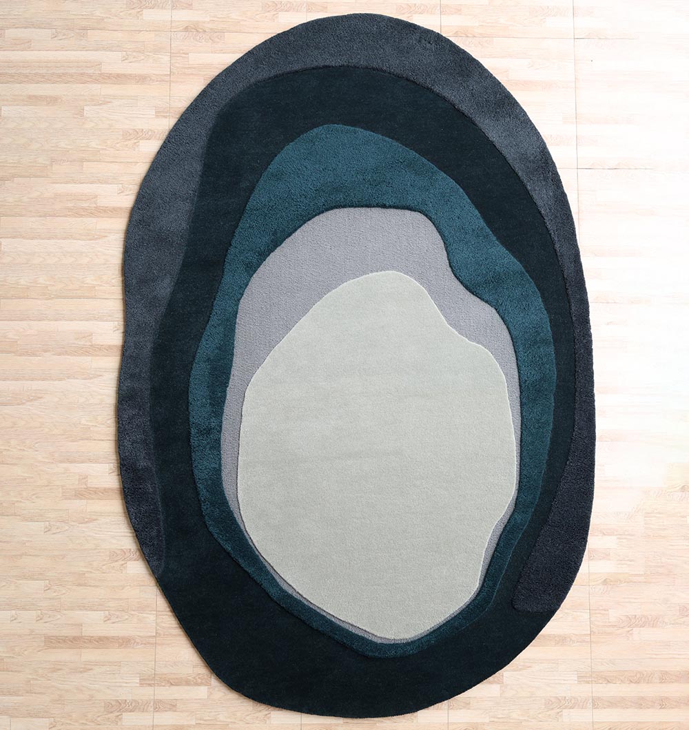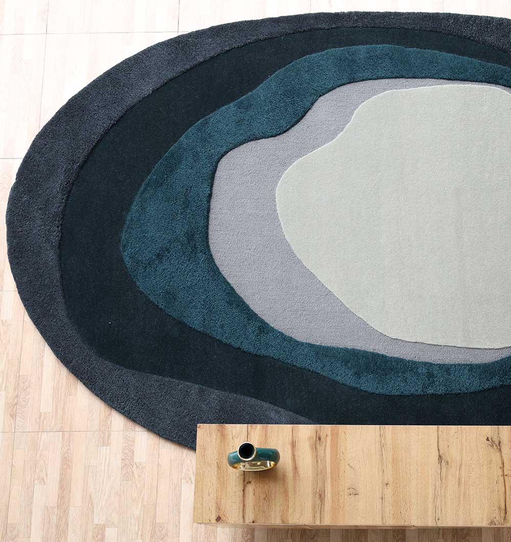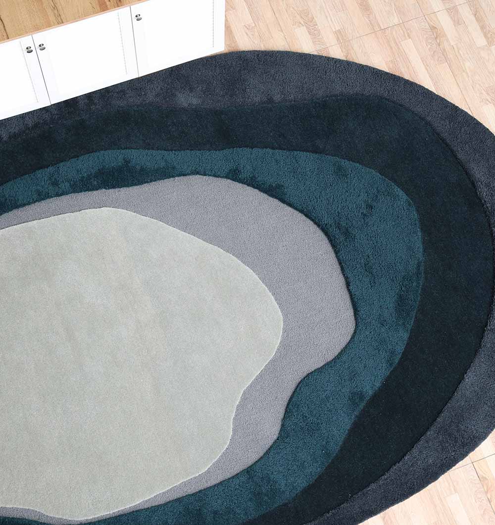 The HTW-131 Layered Abstract Shaped Rug is a high-performance artisanal piece designed to bring a calming, modern aesthetic to expansive living areas. This 200x300 cm shaped rug features a sophisticated concentric design with organic, nested "pools" of color, ranging from deep charcoal and teal to soft grey and mist. Expertly handcrafted from a premium heavy-duty blend of 80% wool and 20% cotton, it boasts a substantial weight of 30 kg, ensuring it remains perfectly flat and stable even in high-traffic zones. With a plush 1.5 cm pile height, it provides exceptional underfoot warmth and sound insulation. The fluid, asymmetrical silhouette and cool-toned multicolor palette make it a perfect choice for minimalist or contemporary luxury interiors seeking a durable yet artistically refined floor covering.