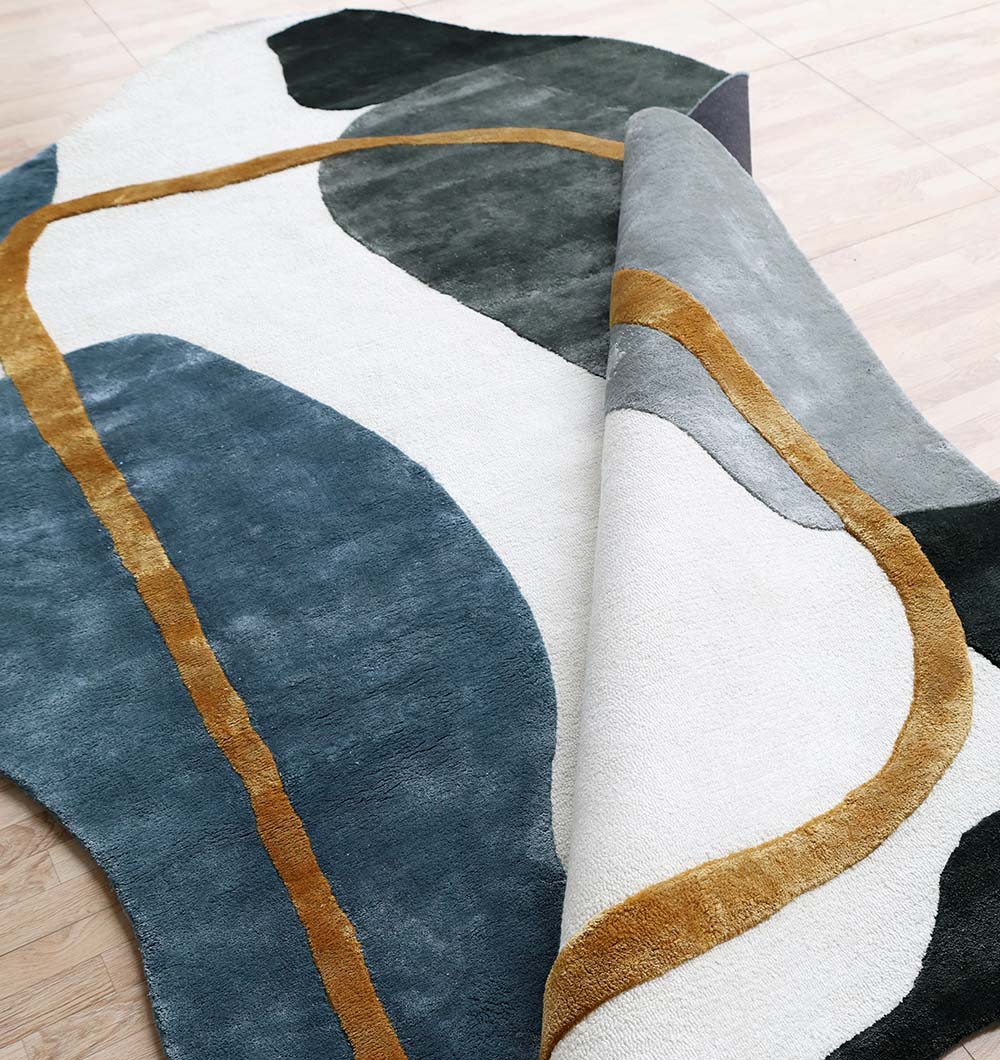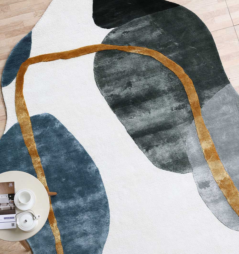 The HTV-24 Modern Tencel Shaped Rug is a premier choice for high-end home decor, offering a stunning blend of silky texture and contemporary abstract art. This large 200x300 cm rug features an organic, irregular silhouette with a sophisticated color-block design in shades of deep charcoal, cool blue-grey, and crisp white, accented by a bold, hand-carved gold border. Expertly handcrafted from a luxurious blend of 80% Tencel and 20% cotton, it delivers an exceptional silken sheen and a soft, cooling touch underfoot. Weighing a substantial 30 kg, this high-density rug provides superior stability and a weighted presence, while the 1.5 cm pile height ensures a plush, comfortable feel. Its avant-garde design and premium material composition make it a perfect centerpiece for minimalist living rooms, luxury lounges, or expansive master suites.