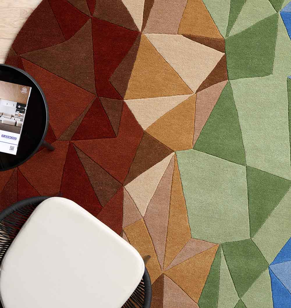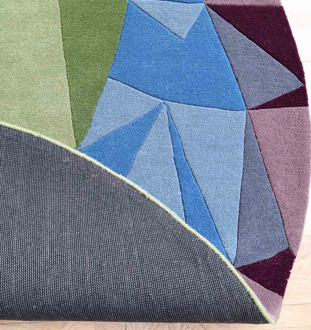 The HTW-130 Modern Geometric Round Rug is a vibrant masterpiece of contemporary floor art, designed to bring a bold energy to your interior spaces. This 200 cm round rug features a captivating mosaic of triangular facets, transitioning through a rich spectrum of sunset oranges, earthy greens, and deep oceanic blues. Meticulously handcrafted from a premium heavy-duty blend of 80% wool and 20% cotton, it offers a substantial weight of 20 kg, ensuring exceptional durability and floor stability. With a plush 1.5 cm pile height, it provides superior underfoot comfort and thermal insulation. Its perfect circular form and intricate geometric pattern make it a stunning focal point for modern dining areas, creative offices, or eclectic living rooms seeking a touch of artisanal luxury.